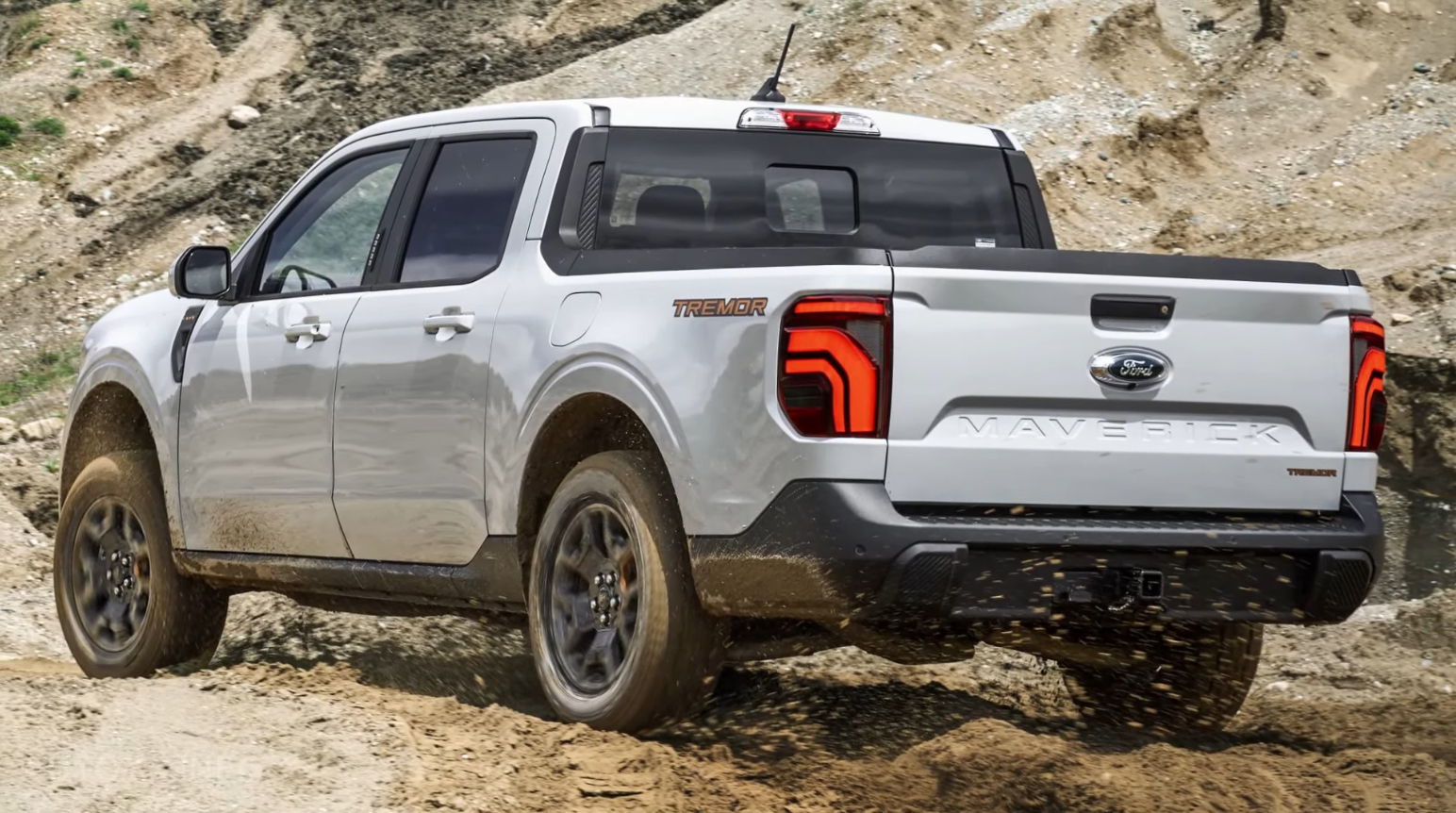 The current Maverick has a distinctive look, combining crossover elements with a classic truck rectangular bed. The front end features C-shaped headlights with a square grille with a horizontal bar that splits the headlights. The rear end has vertical taillights and a tailgate that can be configured differently. The Maverick also has a Flexbed system that allows users to customize the bed with various accessories and storage solutions.